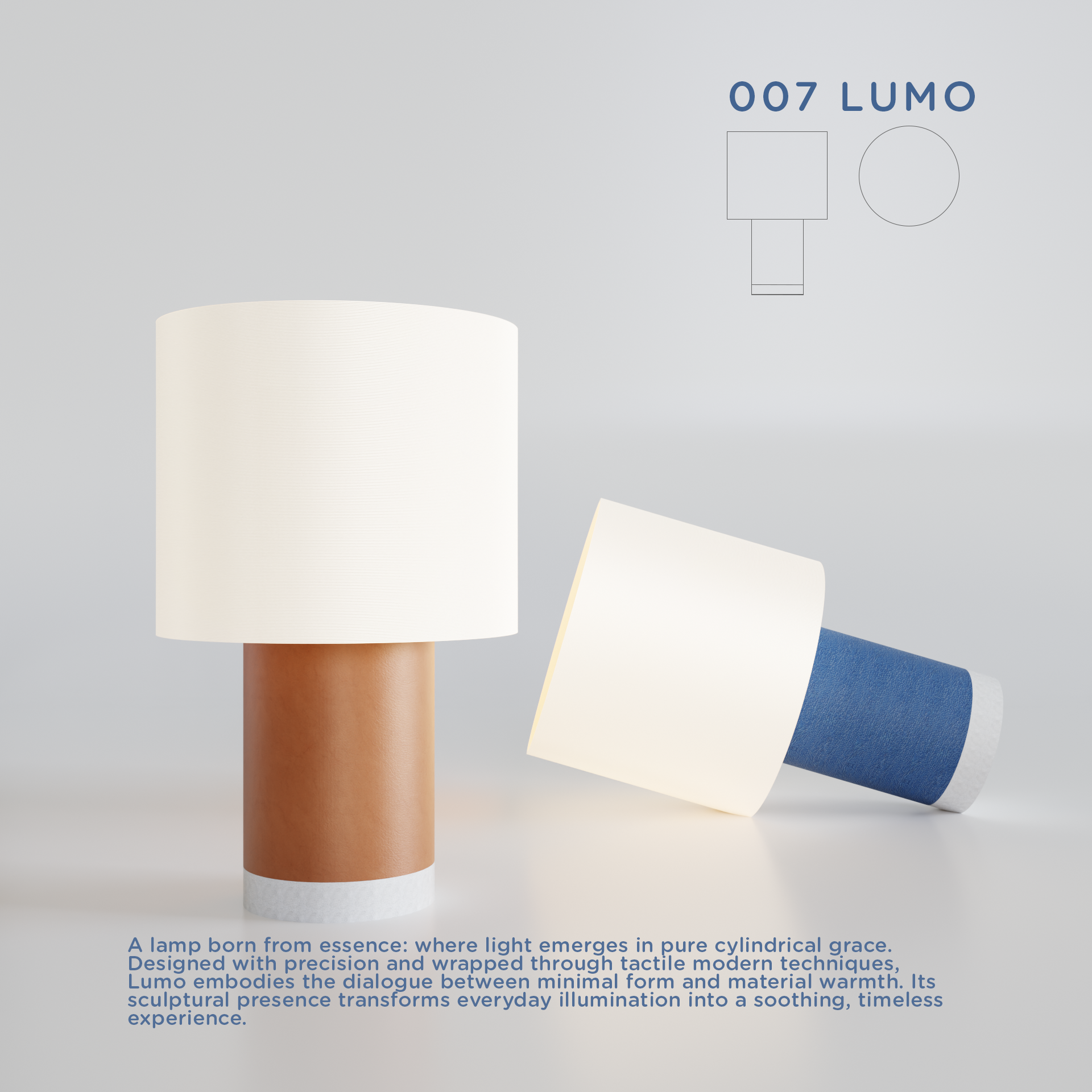 Lumo is an innovative table lamp that merges 3D printing with tactile natural elements, delivering a soft, diffused light ideal for illuminating contemporary workspaces or serene reading nooks. Its cylindrical form, wrapped in supple ecological leather over a weighted jesmonite base, offers a refined contrast of textures and stability, serving as a thoughtful accent in understated, tactile driven environments.